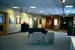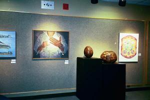 A view of one wall in the gallery, with (l to r) Chuck Baird's Crocodile Dundee and Art No. 2, Tony Landon McGregor's two gourds,